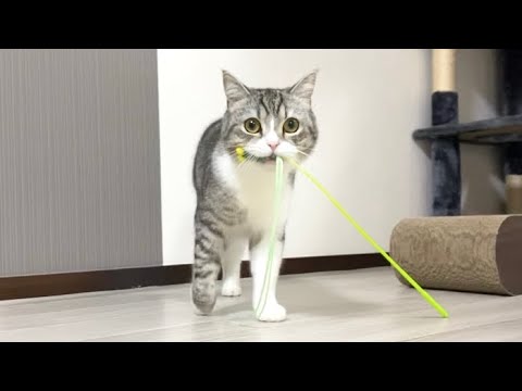 遊んでほしいとおもちゃを咥えて持ってくる猫がこちらです笑